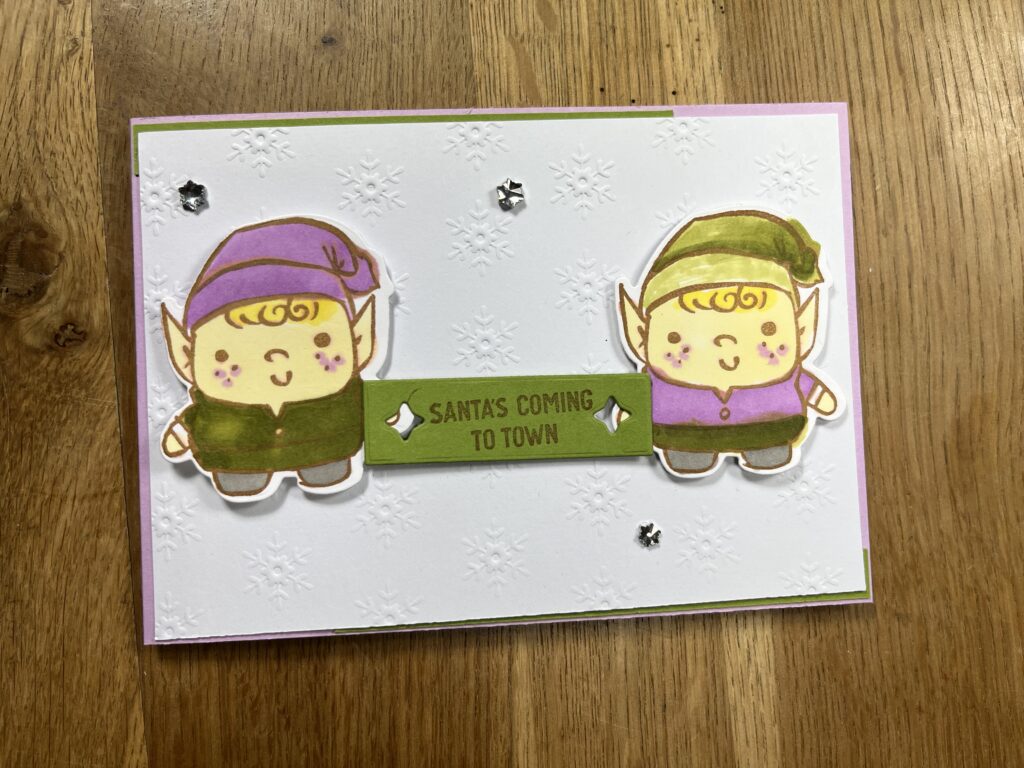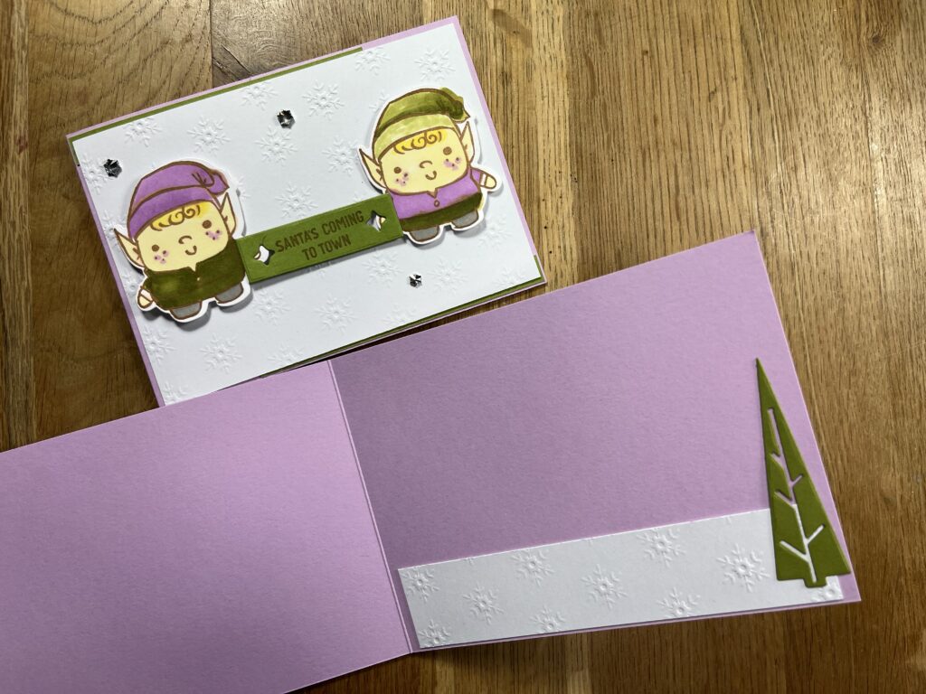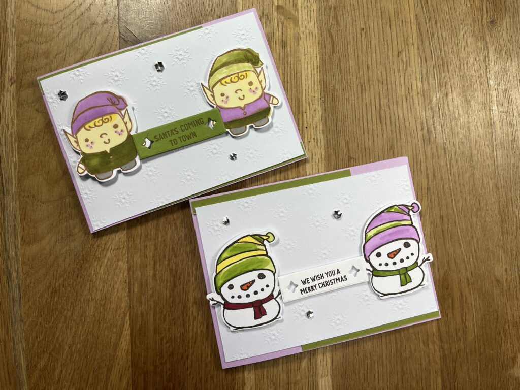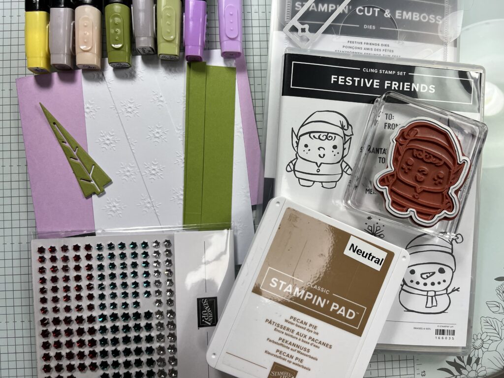 Mein zwei Wichtel sind in den Farben , Stampin´Blends hell Zitronenparfait, SU 800, h/dk Olivgrün, h/dk Fresienlila, h/dk Granit gehalten, Stempelkissen Pekannuss, Stempelset / Stanzformen Festive Friends. Die Hautfarben von SU! sind in den Farbverläufen von SU 100 – 1000 zu finden.
