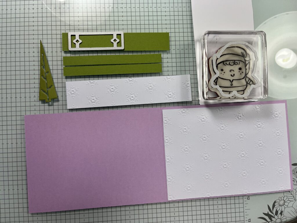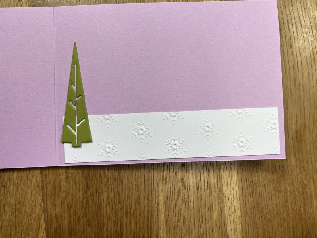 Grundkarte habe ich in Fresienlila gewählt 29,9 x 10,5 gefalzt bei 14,85 cm, zwei Olivgrüne Streifen in 11 x 1 cm einen Tannenbaum und für meine Schild auch etwas Rest; DSP leise rieselt der Schnee (gibt es in 3 Karton 12 x 12 Inch) 14,4 x 10 cm; Rest in 9 x 3 cm, Facettierte Schneeflocken