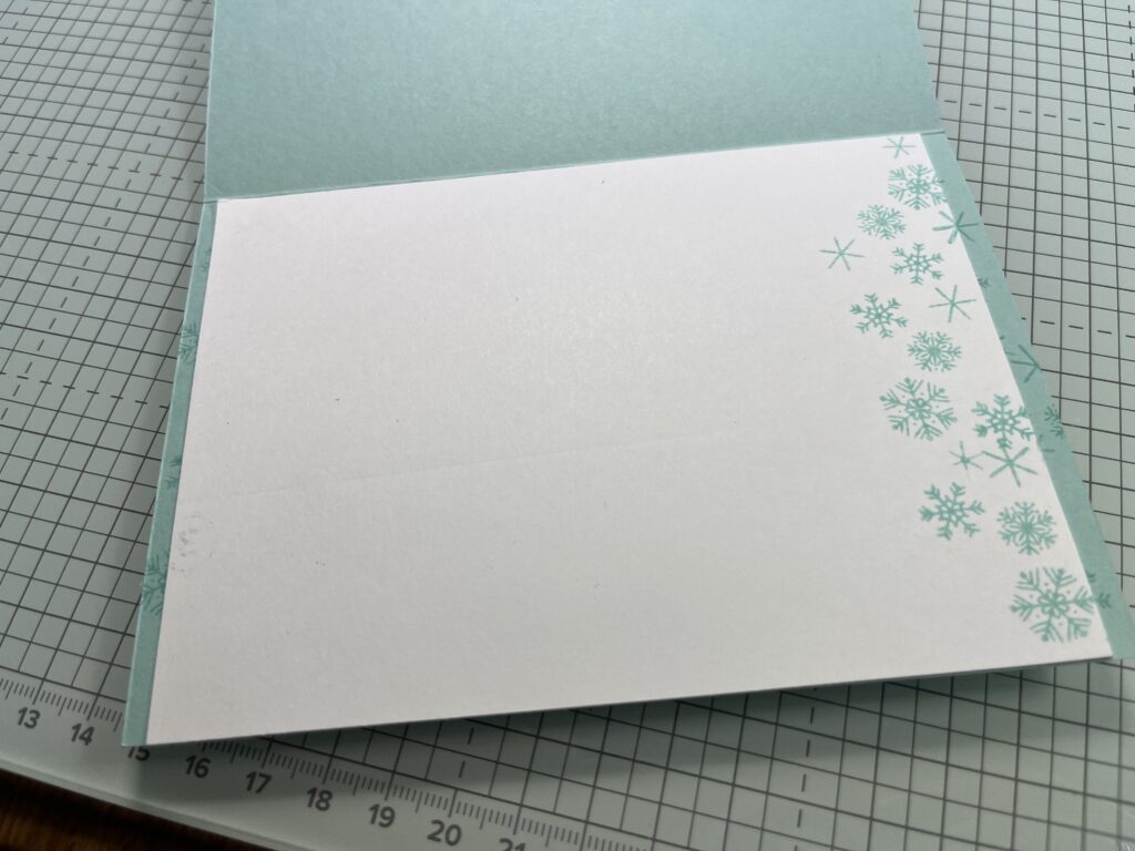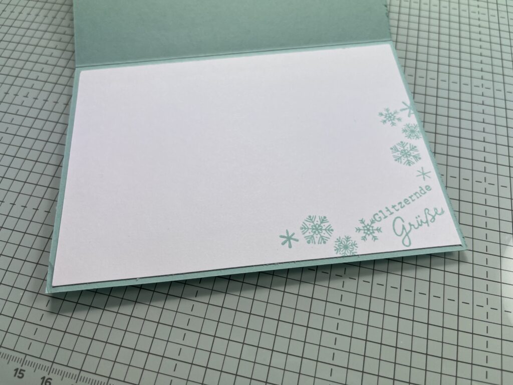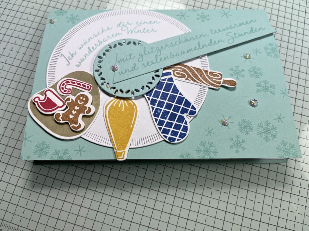Grundkarte in Aquamarin 21 x 14,85 cm falzen lg.S. 10,5 cm; Innenaufleger 14 x 10,4 cm in Grundweiss; Figuren aus Stempelset und Stanzformen Homemade treats Glutrot, Blaubeere, Osterglocke, Pekannuss, Spruch: Glitzernder Winter (Sts) in Aquamarin auf Grundweiss; Kreise: Naturverliebte Kreise; Facettierte Schneeflocken