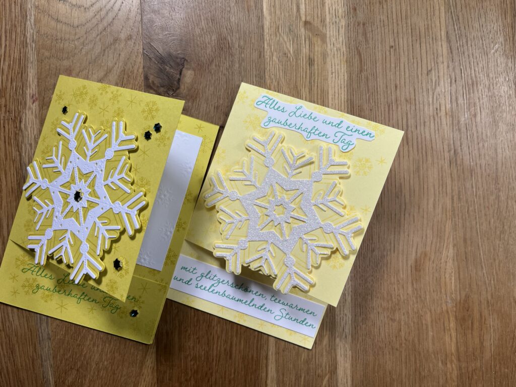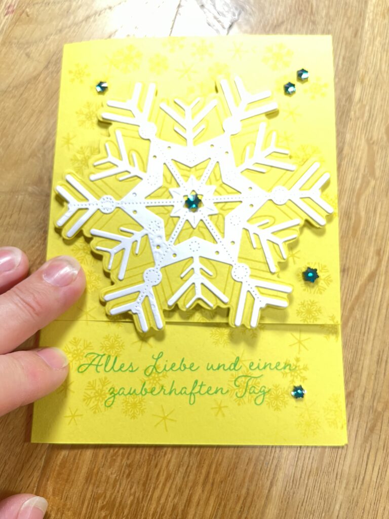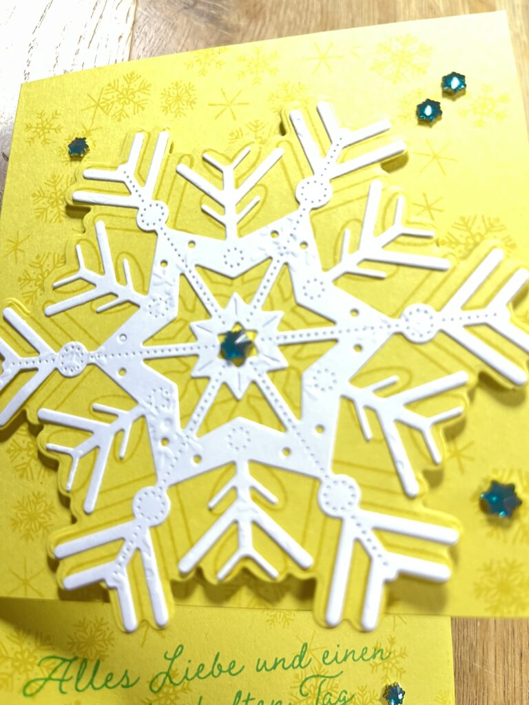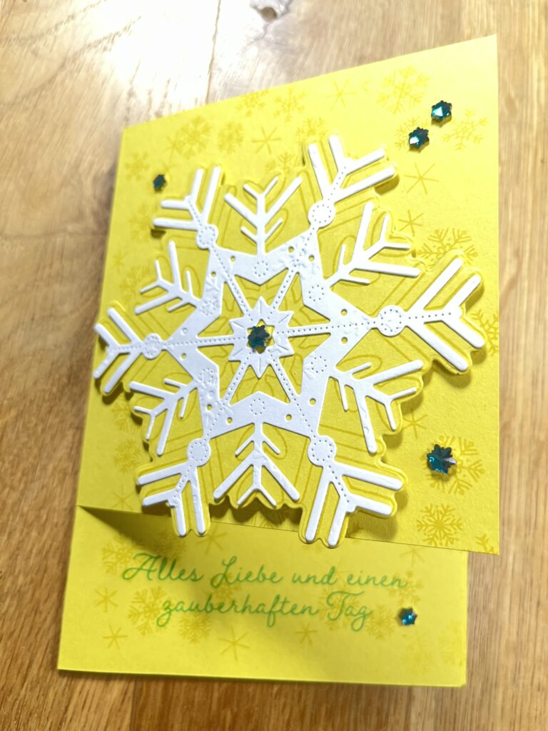 Farbkarton Zitronengelb 14,85 x 21 cm gefalzt bei 10,5 cm Frontseite eingeschnitten von unten bei 3 cm, Innenkarte Grundweiss 9 x 9 cm, Stempelfarbe Jade & Zitronengelb, Facettierte Schneeflocken