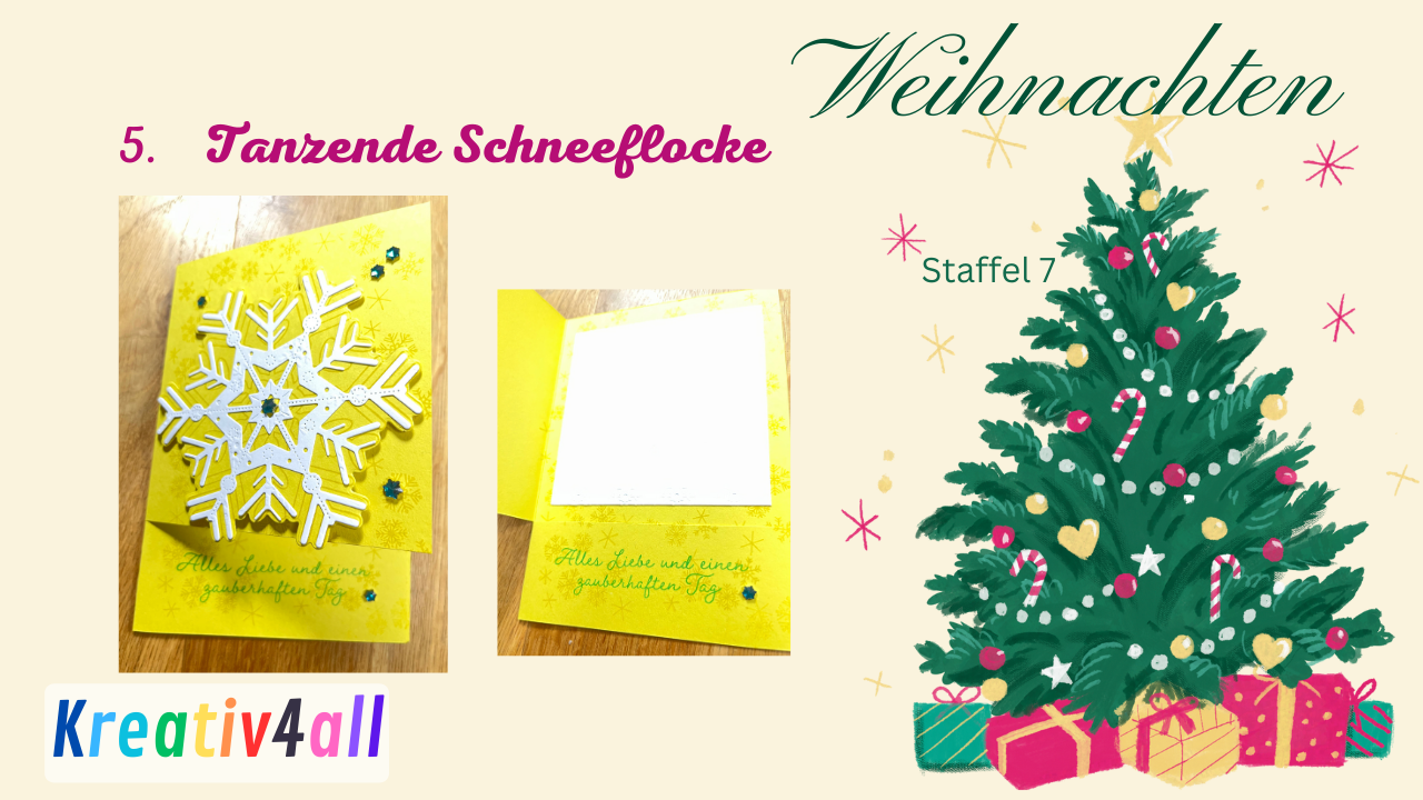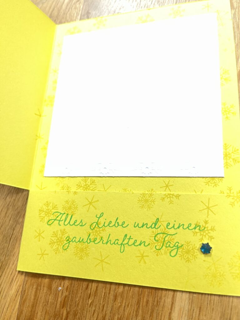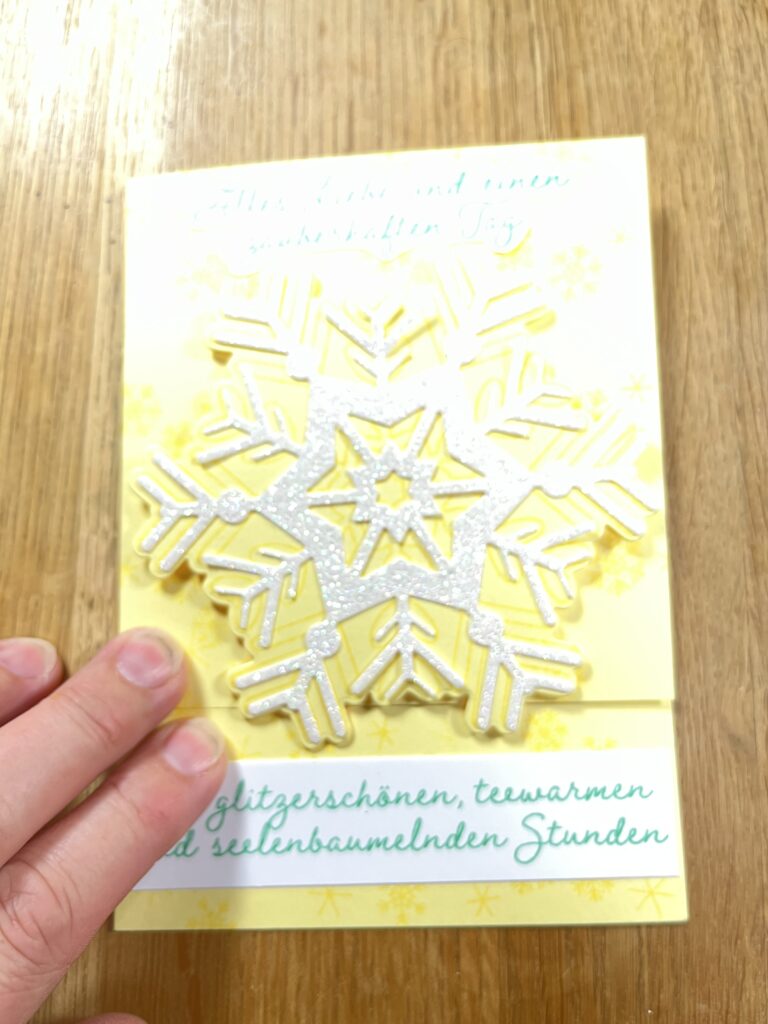 Ho ho ho ihr Lieben, heute gestalte ich eine Schneeflocke mit unseren tollen DSP leise rieselt der Schnee. Es ist ein Grundweisser Farbkarton 12 x 12 Inch mit geprägten Schneeflocken, Untergrund in Zitronengelb gehalten. Es ist eine Karte, um eine Gutscheinkarte einzustecken.
