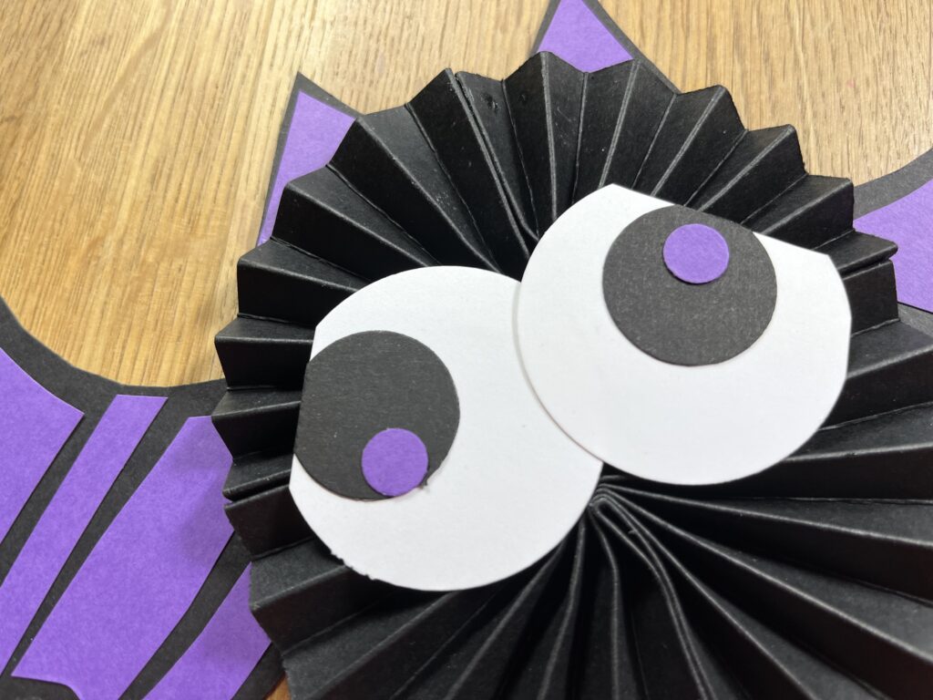 Farbkarton schwarz etwas weiß und Amethyst, Flügel schwarzen Farbkarton 21 x 9,5 cm mittig falten und einen Flügel mit Bleistift aufmalen. Augen Kreisstanzen 1 7/8 Inch, 1 Inch und 3/8 Inch ( die letzten beiden sind nicht mehr im Sortiment erhältlich), Ohren Farbkarton schwarz und Amethyst