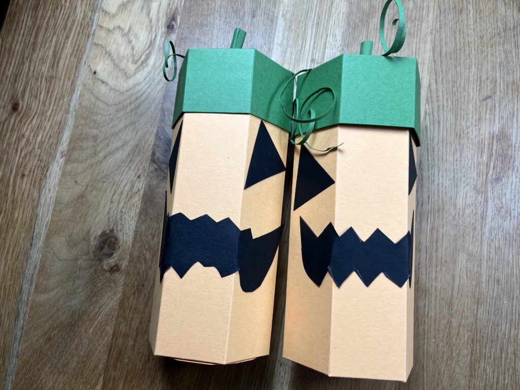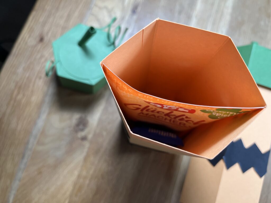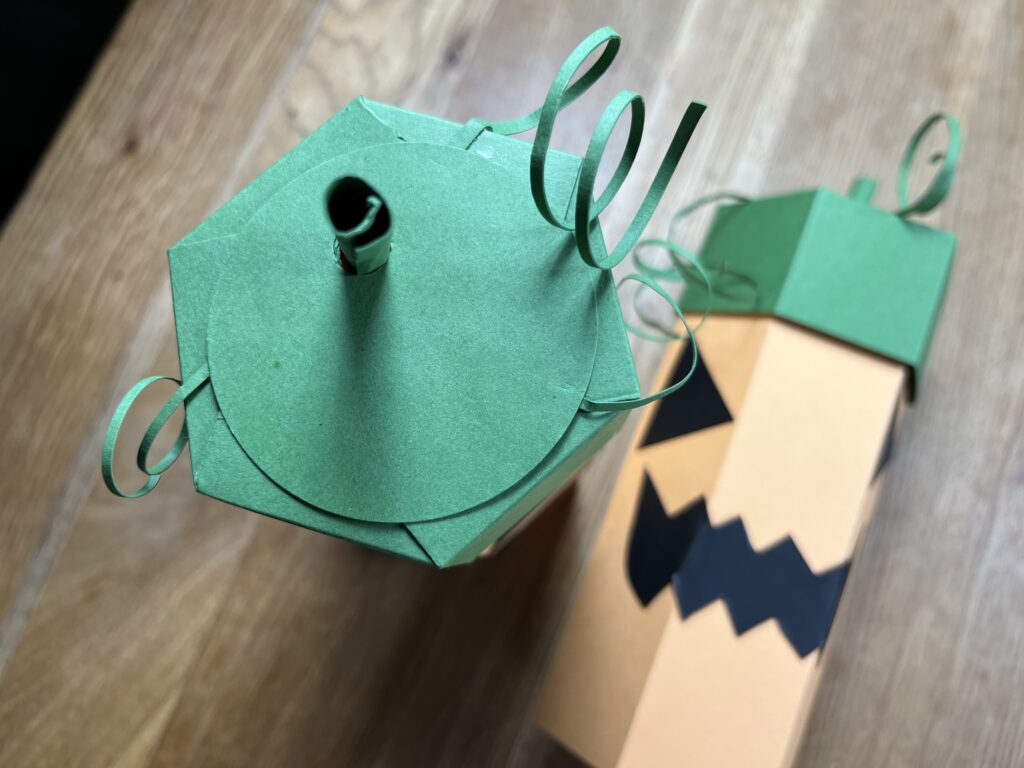Boden Farbkarton Pfirsichcreme 21 x 25 cm kz. S. falzen 18 cm und lg. S. falzen bei 4 / 8 / 12 / 16 / 20 / 24 cm. Deckel aus Farbkarton Gartengrün 6,5 x 25,6 cm kz. S. falzen 2,5 cm und lg. S. falzen bei 4,1 / 8,2 / 12,3 / 16,4 / 20,5 / 24,6 cm, Ministreifen 3x und Strohhalm 3 x 9 cm; Fratze Farbkarton schwarz (2x) Augen 4 x 4 cm, Mund 12 x 7 cm