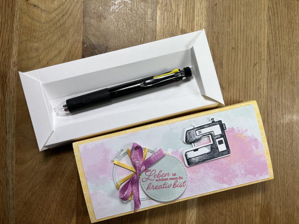 Hallo ihr Lieben, heute habe ich eine Matchbox gestaltet, die eine Vertiefung für einen Stift für Markierungslinien auf Stoff hat. Mein Maß für den Stift ist etwas größer als er selber ist 15 cm.