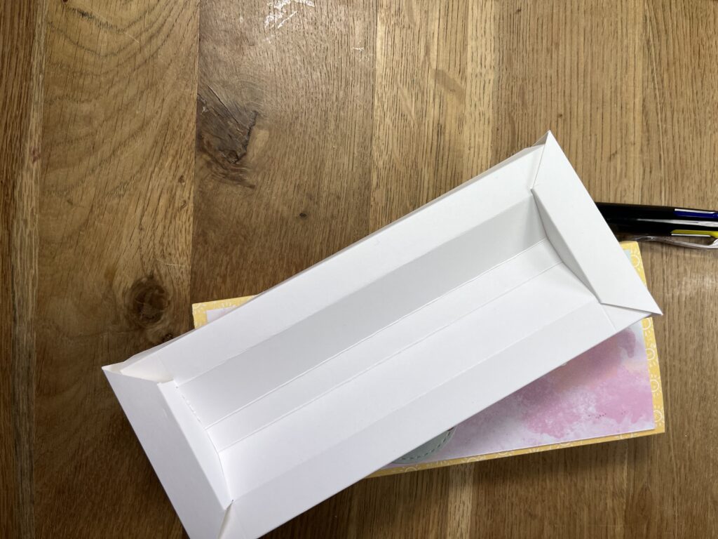 Um die Öffnungen zu schließen der Längsseite benötigt man 2x) 8 x 6,6 cm; 6,5 cm falzen bei 2 / 3,6 / 5,6 / 6,6 cm Dann lange Seite wird von der 2 cm Falz bei 1,5 cm eingeschnitten und schräg zur 2. Falz nach außen abgeschnitten. Bitte von beiden Seiten machen.