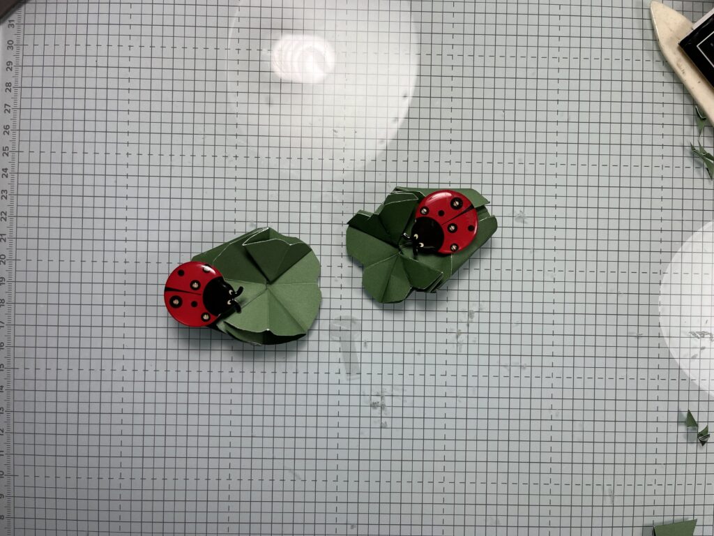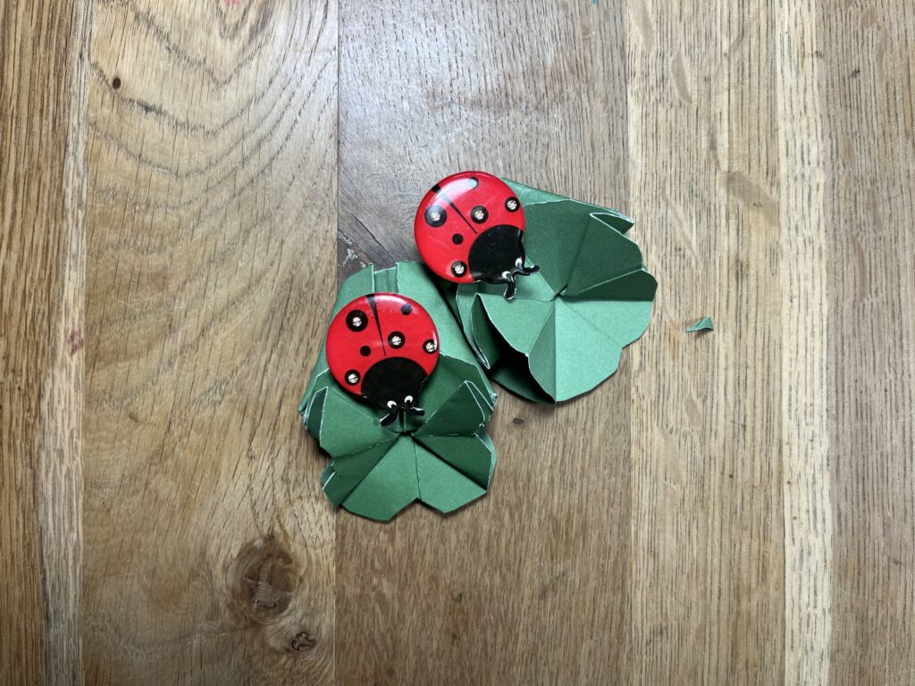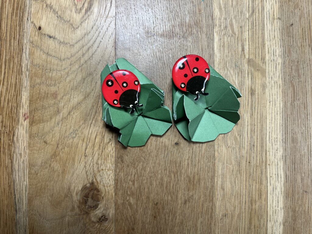 Für das vierblättrige Kleeblatt 15 x 15 cm Farbkarton 12 x 12 Inch Gartengrün, das Papier ist etwas dünner als der A4 Farbkarton und lässt sich besser „Origami“falten. Mit der Schere malträtieren, dass es aussieht wie ein vierblättriges Kleeblatt.