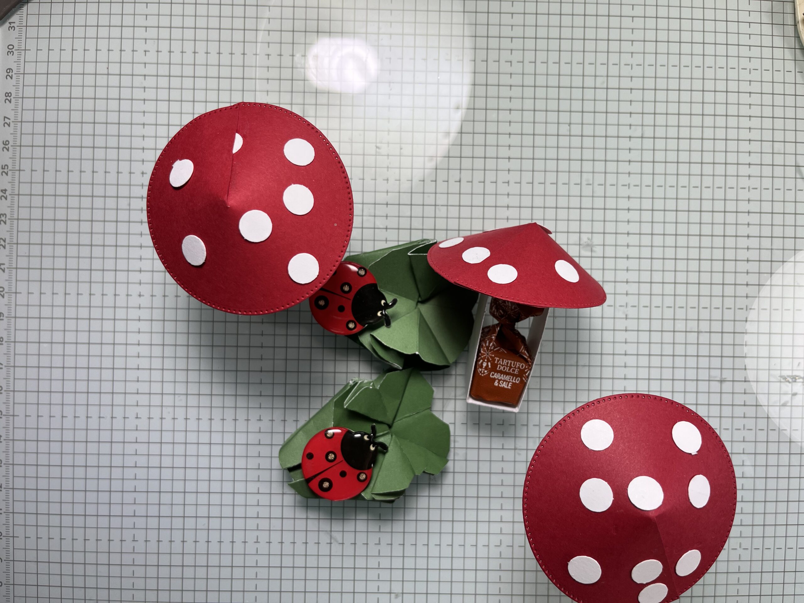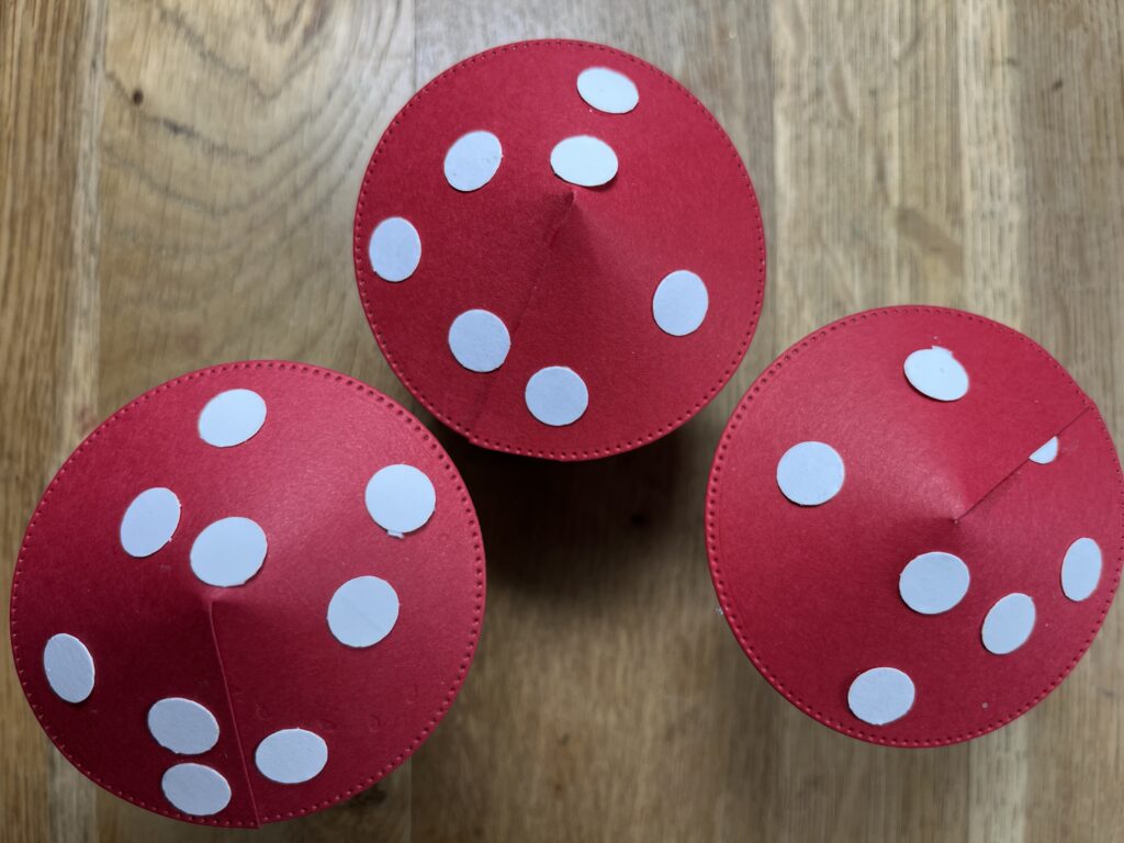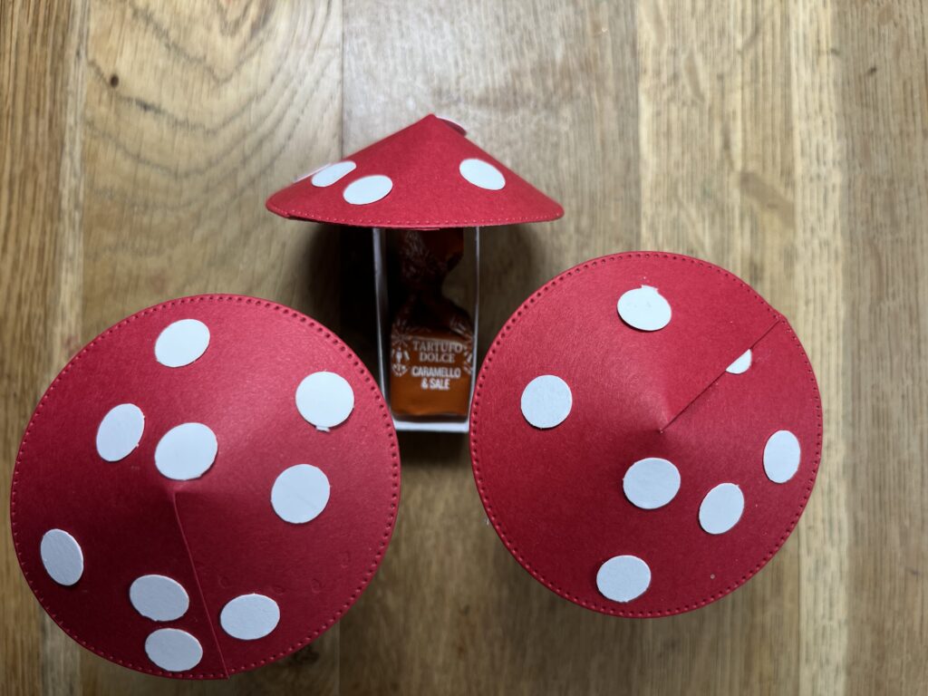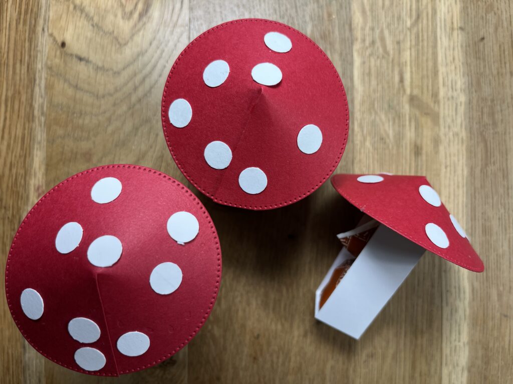 Fliegenpilz benötigt ihr „Basic mit Pepp“ größter Kreis in Glutrot , Minipunkte in 3/8 Inch (anderer Hersteller) in Grundweiss, Körper Grundweiss 2 cm x 18 cm falzen 2 x / 8 / 10 / 16 cm mit Flüssigkleber zusammenkleben und den Pilzhut mit 2x 3 Dimensionale aufkleben. Sweet mit Glue dot aufkleben.