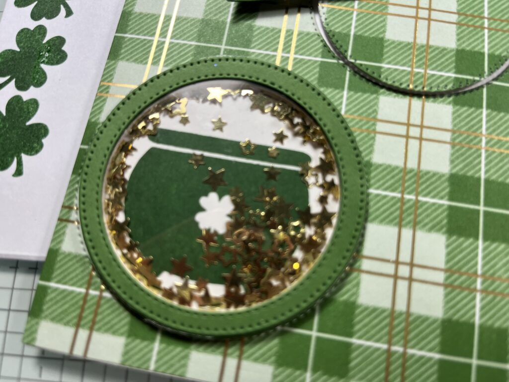 Ich benötige nur noch Basic mit Pepp unterschiedlich große Kreise, etwas Fensterfolie, goldene Streu-Sterne, Schaumstoffklebeplatte, Flüssigkleber, Demensionals, Stempelfarbe Gartengrün