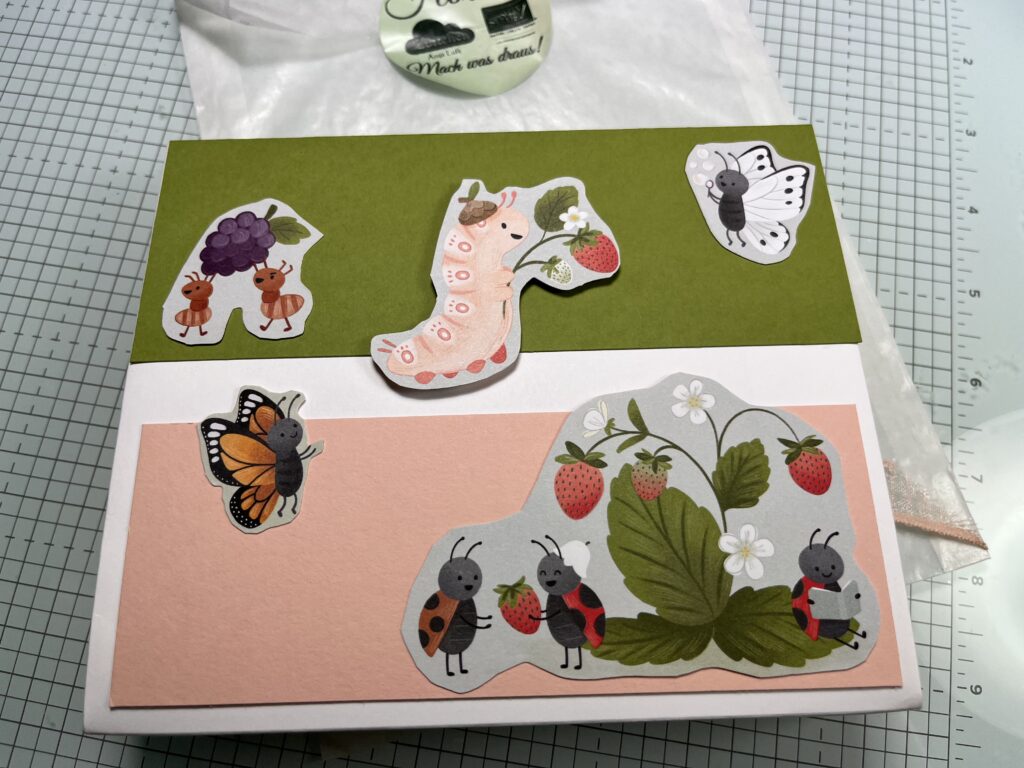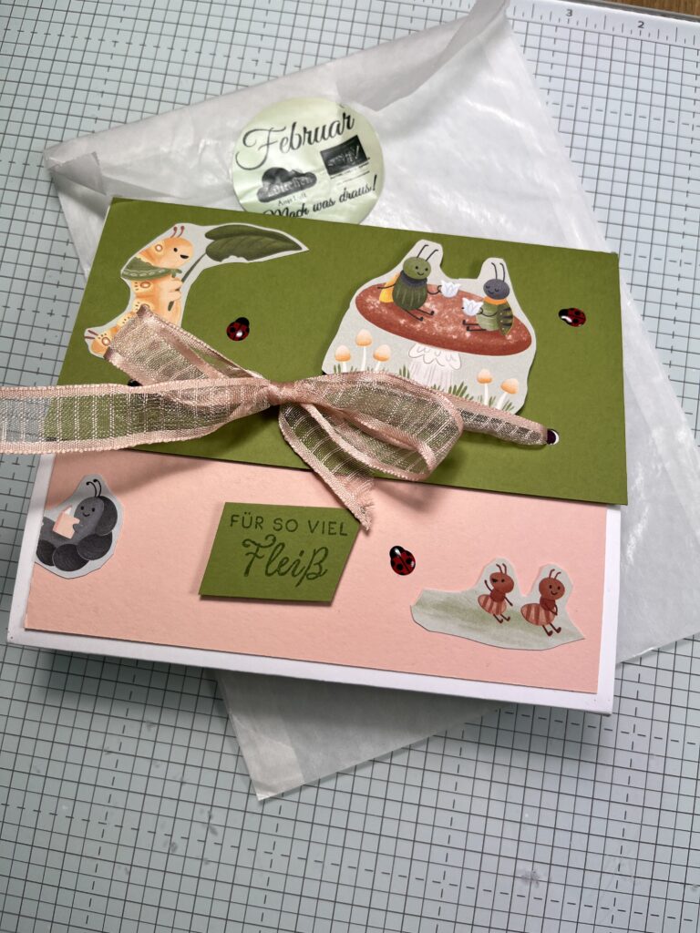 Die schönsten Käfer aus den 2 DSP´s habe ich dann noch mit der Schere ausgeschnitten auf die Front und Rückseite geklebt. Das Reststück in Olivgrün wurde dann noch mit einem schönen Spruck verziert. Die Marienkäfer-Accessoieres zum Schluss auf die Frontseite aktzentuele aufgeklebt.