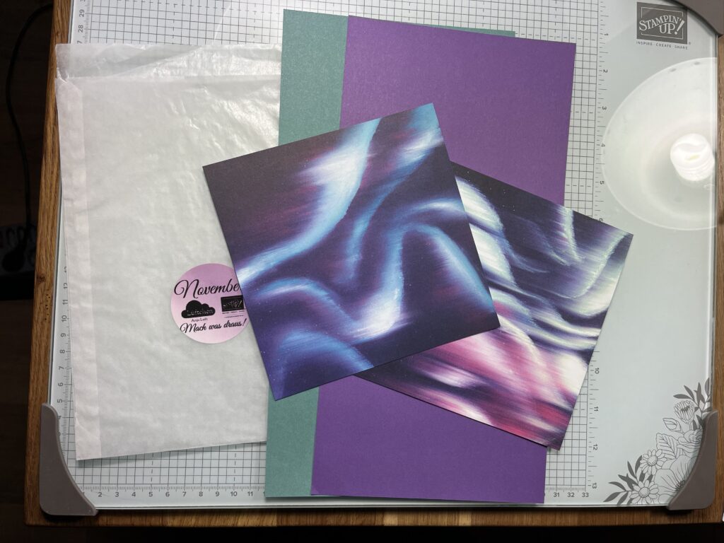 Grundmaterialien: 2 Bögen DSP 6 x 6 Inch Nordlichter, Farbkarton Amethyst 6 x 12 Inch und Lagunenblau 6 x 12 Inch