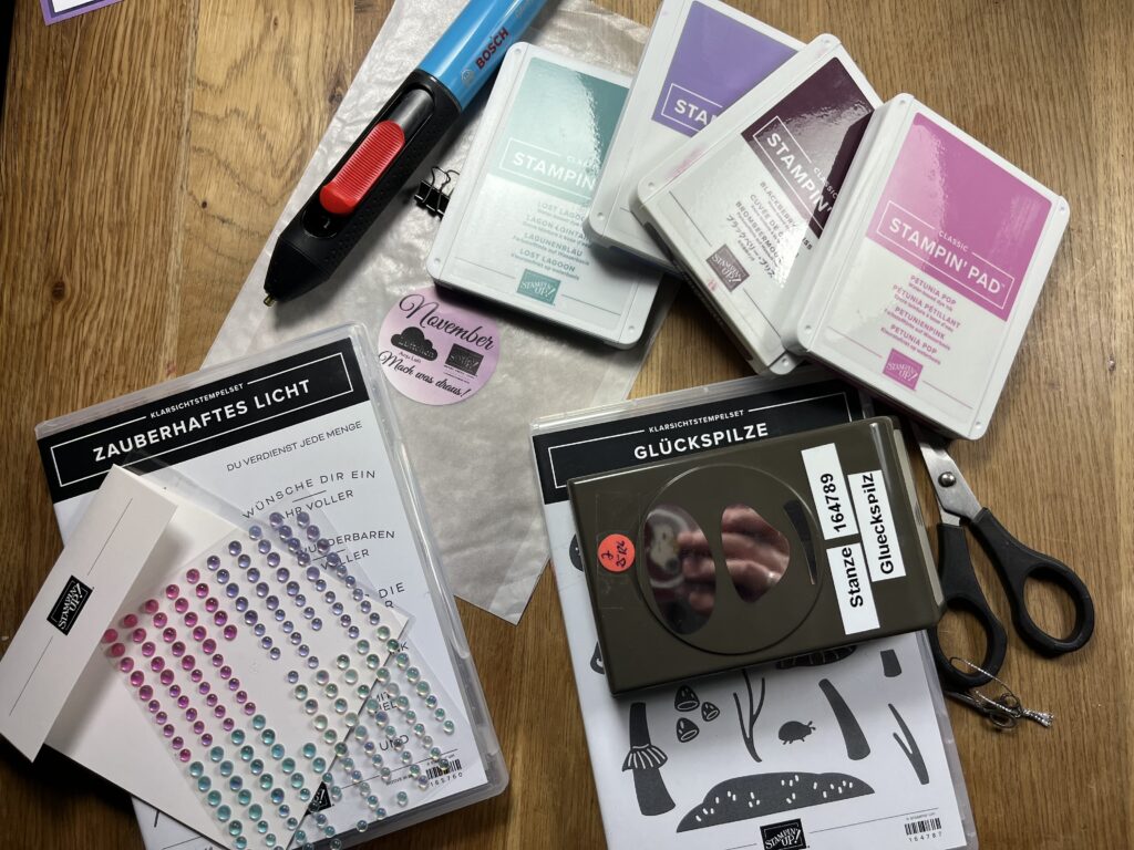Deko-Matierial: Heißklebepistole, Glückspilze Stempel & Handstanze, Zauberhaftes Lichter, Mattierte Halbperlen, Stempelfarbe: Amethyst, Petunienpink, Brombeermoussee, Lagunenblau, Schneid- und Falzbrett, Prägebord in Inch-Maßen