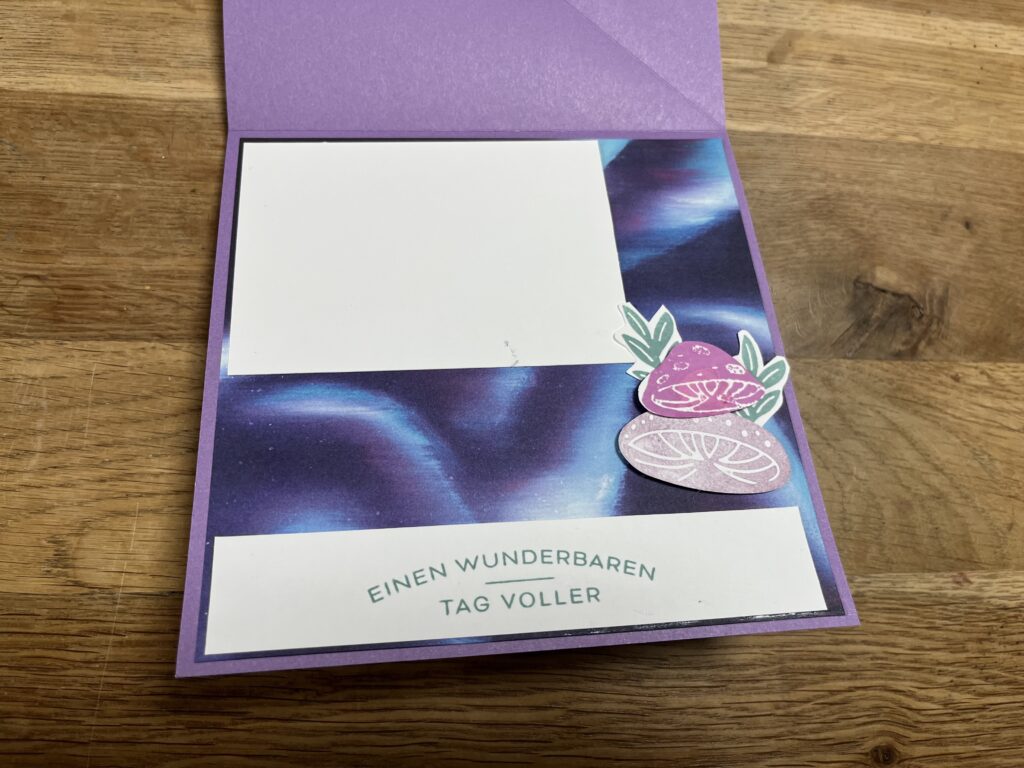 Dekorationen: Glückspilz- Köpfe in Petunienpink, Amethyst und Brombeermousse (sehr hell muss ich mal wieder nachfüllen) Blätter Lagunenblau, sowie der Spruch und „Magie“ (Zauberhaftes Licht) , Innenkarte Grundweiss 7,5 x 10,5 cm
