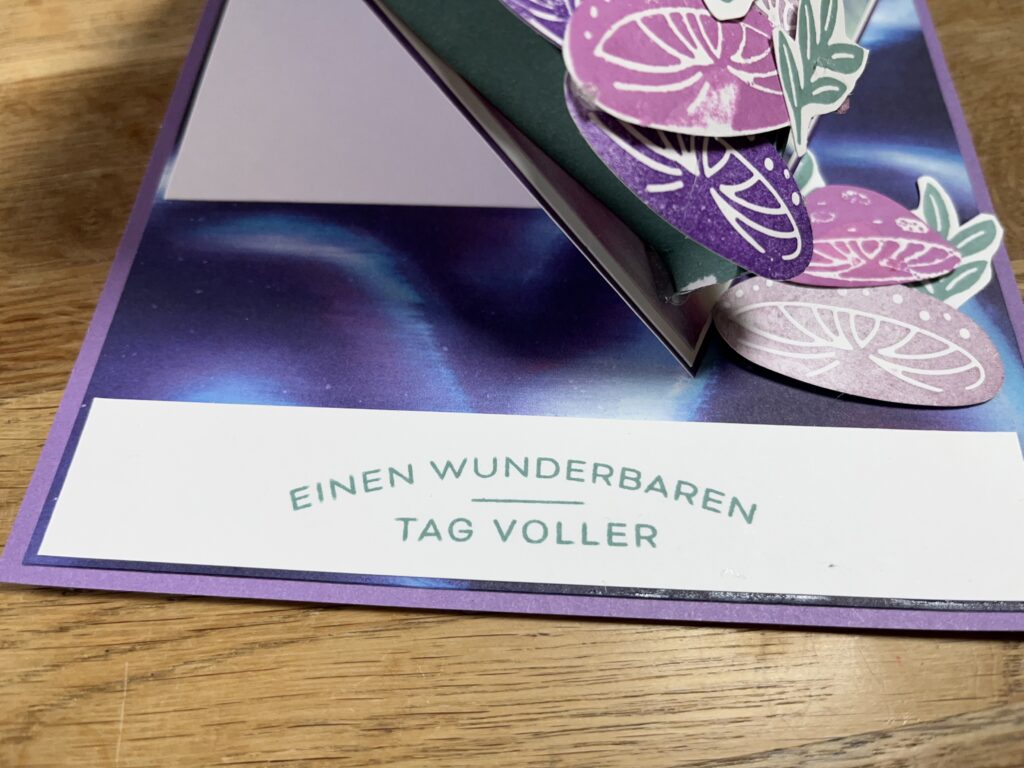 Fk Amethyst lg. S. falzen bei 6 Inch Frontseite abschneiden bei 5 Inch dieses Stück wird von der rechten oberen Ecke der Falzlinie quer bis zur unteren linken Ecke gefalzt. Einen Bogen DSP etwas kleiner als die 6 x 6 Inch zuschneiden 5 3/4 x 5 3/4 Inch. Abstehendes Kartenteil: Grundweiss 5 7/8 x 4 7/8 Inch & DSP 5 3/4 x 4 3/4 Inch Fächer in Lagunenblau 12 x 5 Inch alle 1/2 Inch falzen