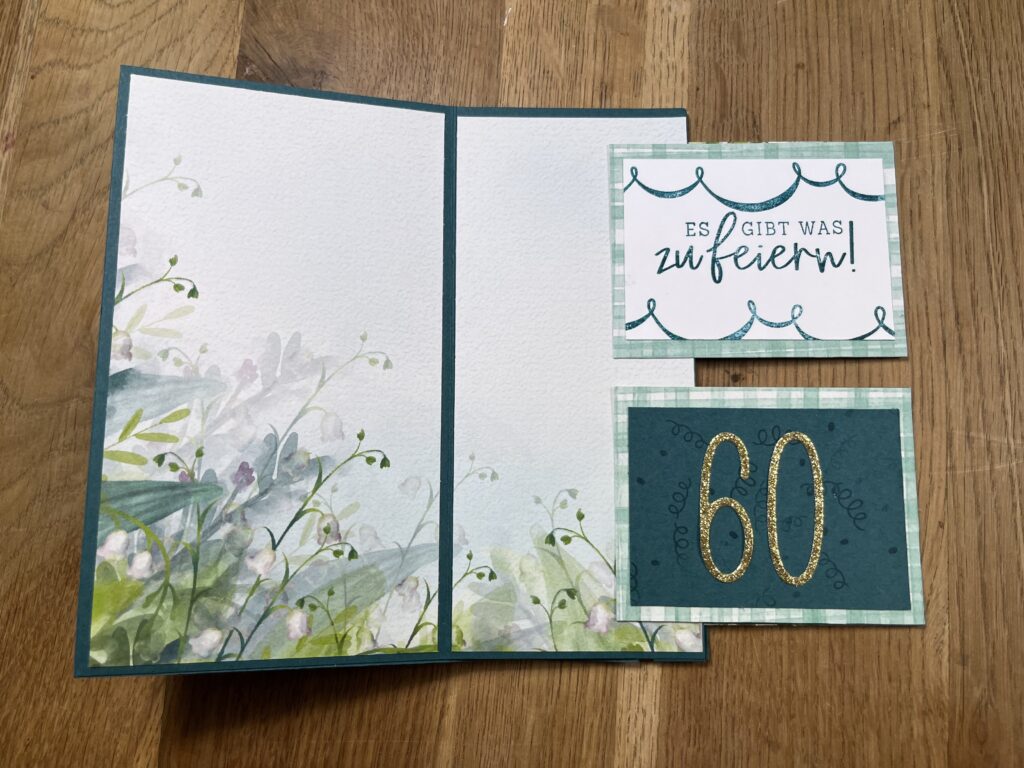 Zur Ausschmückung der Karte habe ich dann noch Fk Grundweiss, Stempelkissen: Gartengrün, Pfauengrün und Grüner Apfel, Stanzformen: gesagtes Alphabet,Maiglöckchen, Grüße mit Textur; Stempelset: Feierliche Ballons, Maiglöckchen, Basicstrass Steinchen; einfache elegante Zierschnur