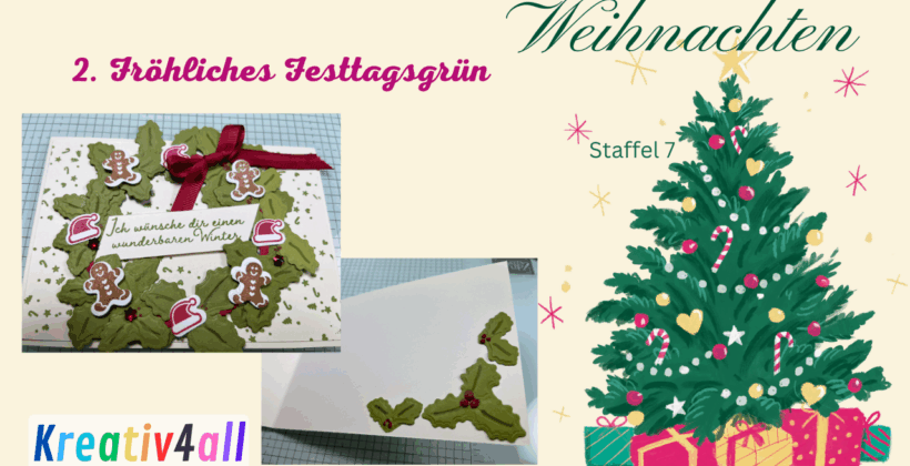 ho ho ho ihr Lieben, meine zweite Karte zeige ich euch heute. Fröhliches Festtagsgrün sp wie das Hybrid-Prägeform heißt habe verwendet und einen Kranz daraus gewerkelt. Die Grundkarte besteht aus Vanille Pur, Olivgrün ; Figuren sind aus Homemade treats: Stempel…